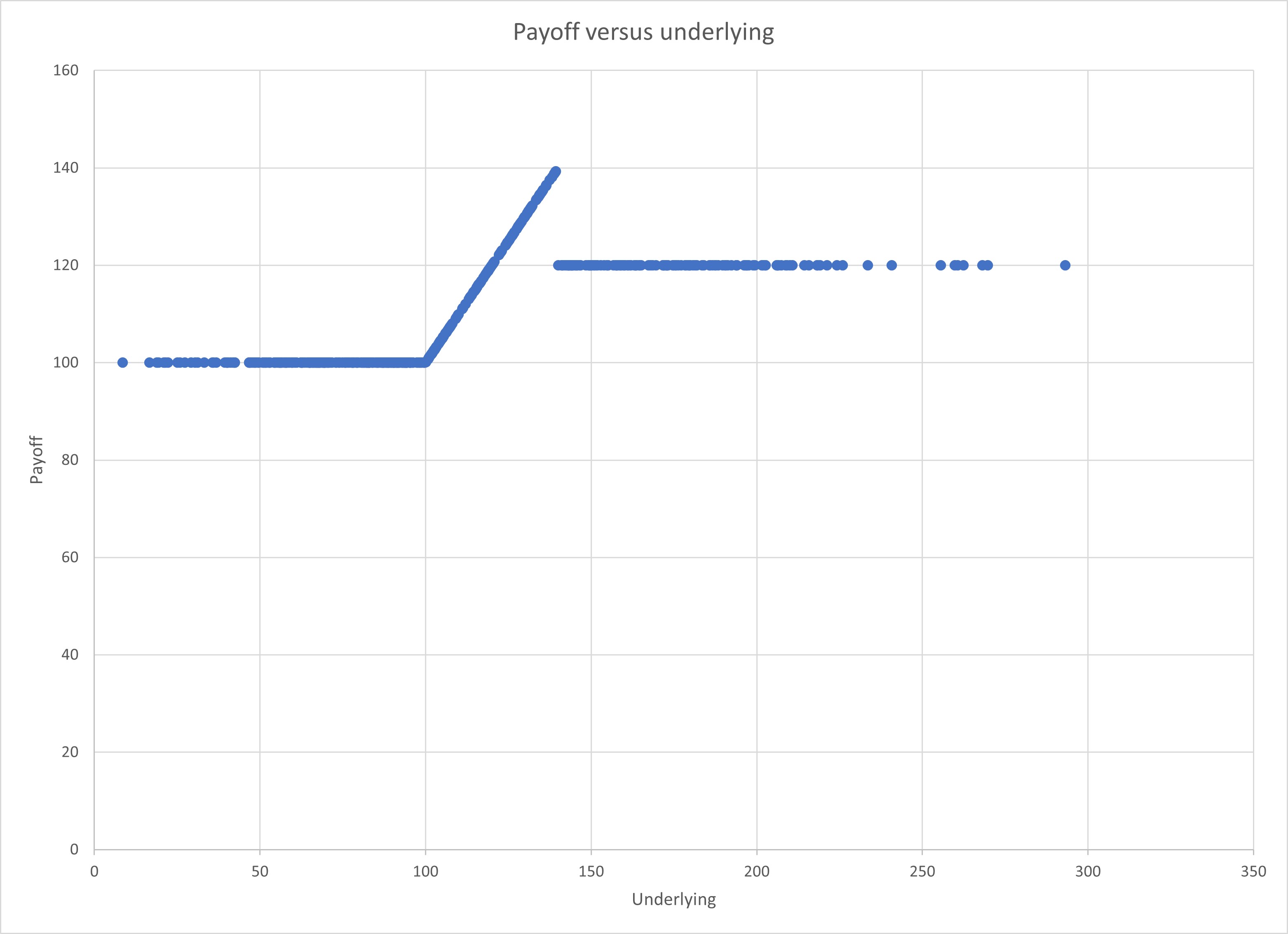 A simple example of a sharkfin product has been recently issued in the UK by Goldman Sachs with Mariana Capital Markets as plan manager. The FTSE CSDI Participation Digital Deposit Plan October 2021 pays 100% of capital at maturity plus a return equal to the growth of the underlying unless the final day barrier of 140% is breached. If indeed this barrier is breached so that the final level of the index is more than 40% higher than its initial level at the end of the product term then the product will pay a fixed return of 20%. The product payoff is illustrated in figure 1 below.