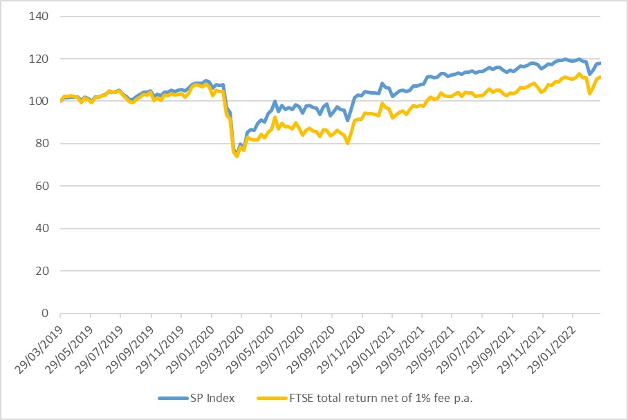 Chart 1: Structured products index vs FTSE TR index (minus 1% p.a. fee)