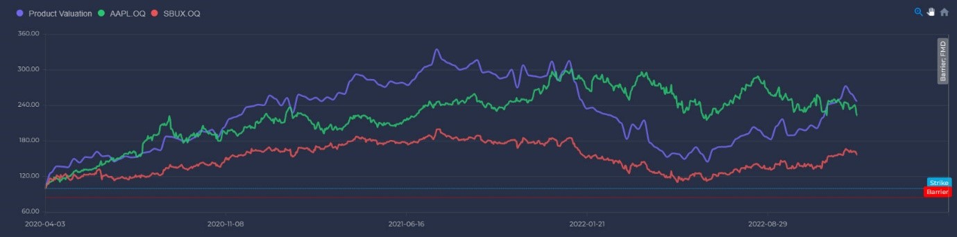 The best performing live product from this group has shown spectacular growth with a current secondary market valuation of 248% and four months of the three year term remaining. This product has 260% upside linked to the worst performing out of Apple and Starbucks (SRP ID 25862562, CUSIP 17328VEK2). These two stocks are in different sectors but both with a strong retail presence and have shown very strong recent growth. Apple is at 222% of its start level and Starbucks somewhat further back at a still positive 157%. Because of the very high leveraged nature of the product its current secondary valuation exceeds that of the Apple stock's performance and with barrier protection of 85% thrown in. There can be few investments that have outperformed Apple over this period.