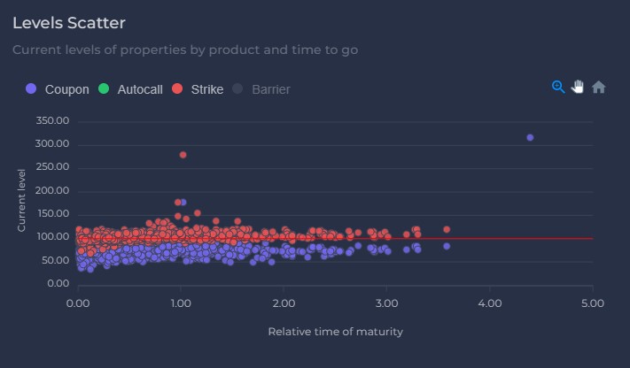 Fig 1: Levels Scatter chart for equity linked callable products striking 24 March 2022 – 24 March 2023 (StructrPro.com)