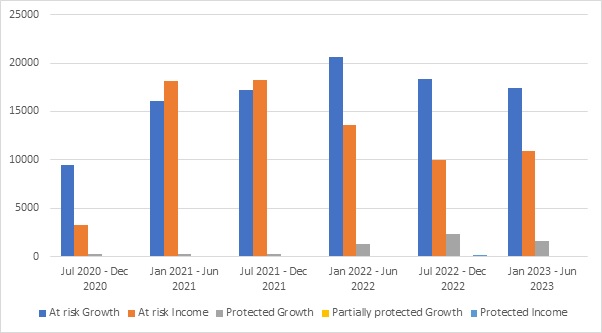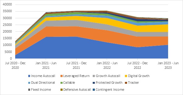 The following analysis has been extracted from StructrPro and covers products striking since July 2020. Products are grouped into six-month periods and the products within each period can then be group into categories of different criteria.
