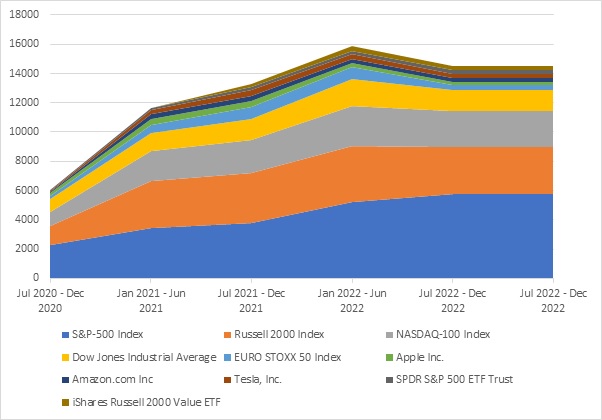 The top five underlyings of the ones shown here are all benchmark stock market indices. These are consistently the most popular underlyings in the US and are used in products either as the sole underlying or as part of a basket. During 2021 when the market was recovering from Covid-19 there was a sharp increase in both the number of products issued and sales volume. During this period the spread of underlyings was greater than for subsequent periods and the proportion of products linked to the top five was lower than for the other four periods although still over 50%. Over the past year the number of products linked to the larger underlyings has been higher and more stable and the last period observed had the highest proportion of products linked to the S&P-500 suggesting some preference for products linked to established names.