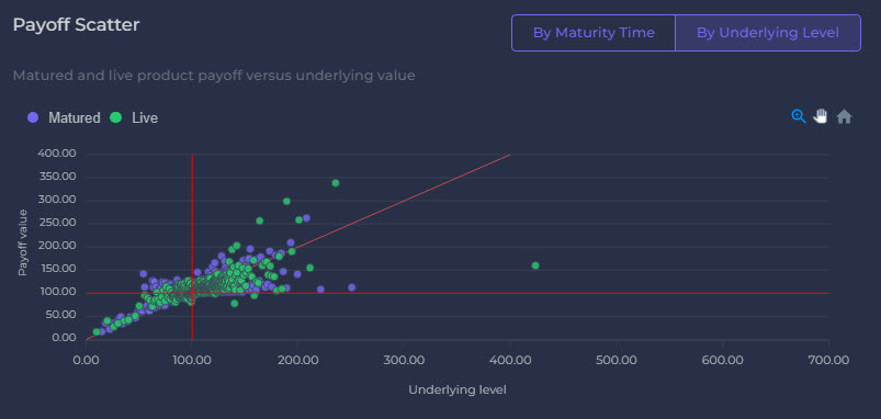 Figure 1 shows the performance of US products (live products represented in green and matured in purple). The underlying performance is given on the x-axis and the payoff of the structured product on the y-axis. The red vertical and horizontal lines are set at 100 represent the initial level of the underlying and product notional. There is a cluster of dots representing individual product payoff in the upper right quadrant, indicating positive growth in both the underlying and structured product. By studying the diagonal red line we can see that there are plenty of instances where the structured product pays more than the underlying and vice versa. While far few products have lost money it can be observed that there hardly any products which have performed below the underlying in the downside case. This is because of the typical protection features present - many structured products have shown return of capital even when the underlying has significantly declined.