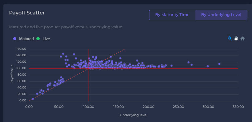 The final figure shows the results of Growth and Income Auto-calls linked to Nvidia that have matured. Given the nature of the product we see consistent product payoffs above the red line, although the underlying performance is quite spread out across the x-axis depending on the timing of the product.