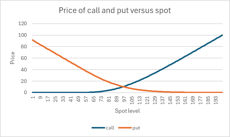 The most obvious property of this chart is that the call price increases with the current stock price, whereas the put price decreases. The price for the call and put are roughly equal for the strike price is equal to the current stock price. More accurately, the rule known as put-call parity states that they will be equal when the strike price is equal to the stock’s forward price, which in this example is 104.08. This is because the value of the upside and downside relative to this strike have equal value on a “risk-neutral” pricing basis.
