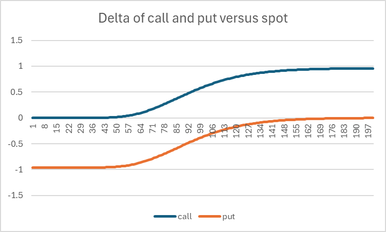 It is also evident that the difference between call Delta and put Delta is constant (a difference of 1) for all spot values. This is a direct consequence of put-call parity.