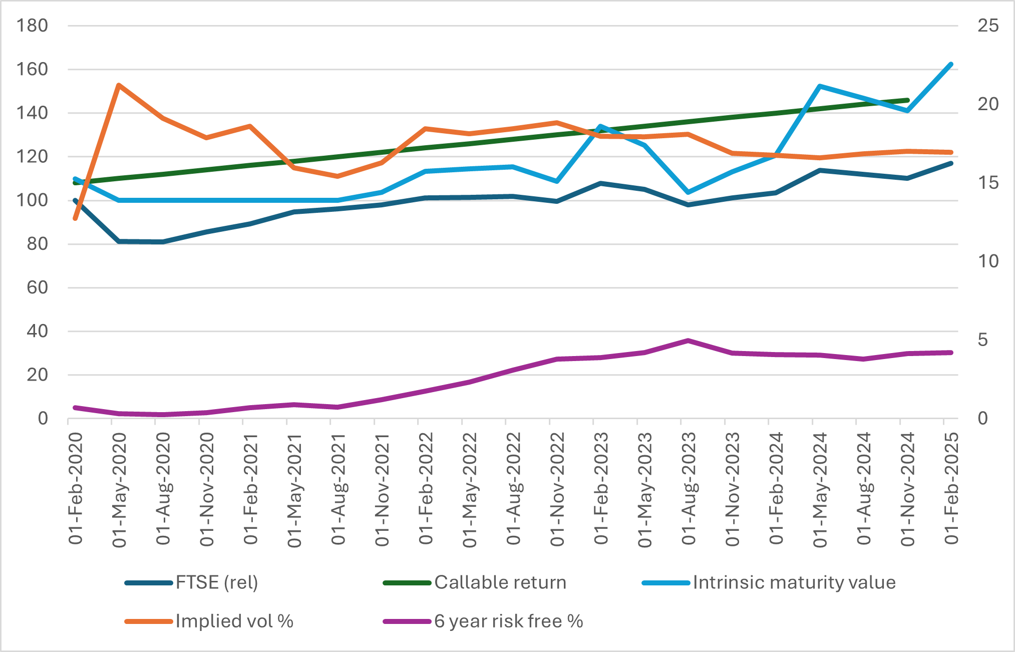 Each metric is shown as of the quarterly observation dates of the product. The straight line indicates the callable payment amounts that would have been paid at each point, equivalent to 8% per year plus capital investment. The intrinsic maturity value is the amount that would be paid if the product was at maturity given prevailing index levels i.e. the capital investment plus three times the growth in the FTSE 100 index floored at zero. For example if the FTSE 100 index is 10% higher than on the strike date at a given time the intrinsic maturity value at that point would be 130%.