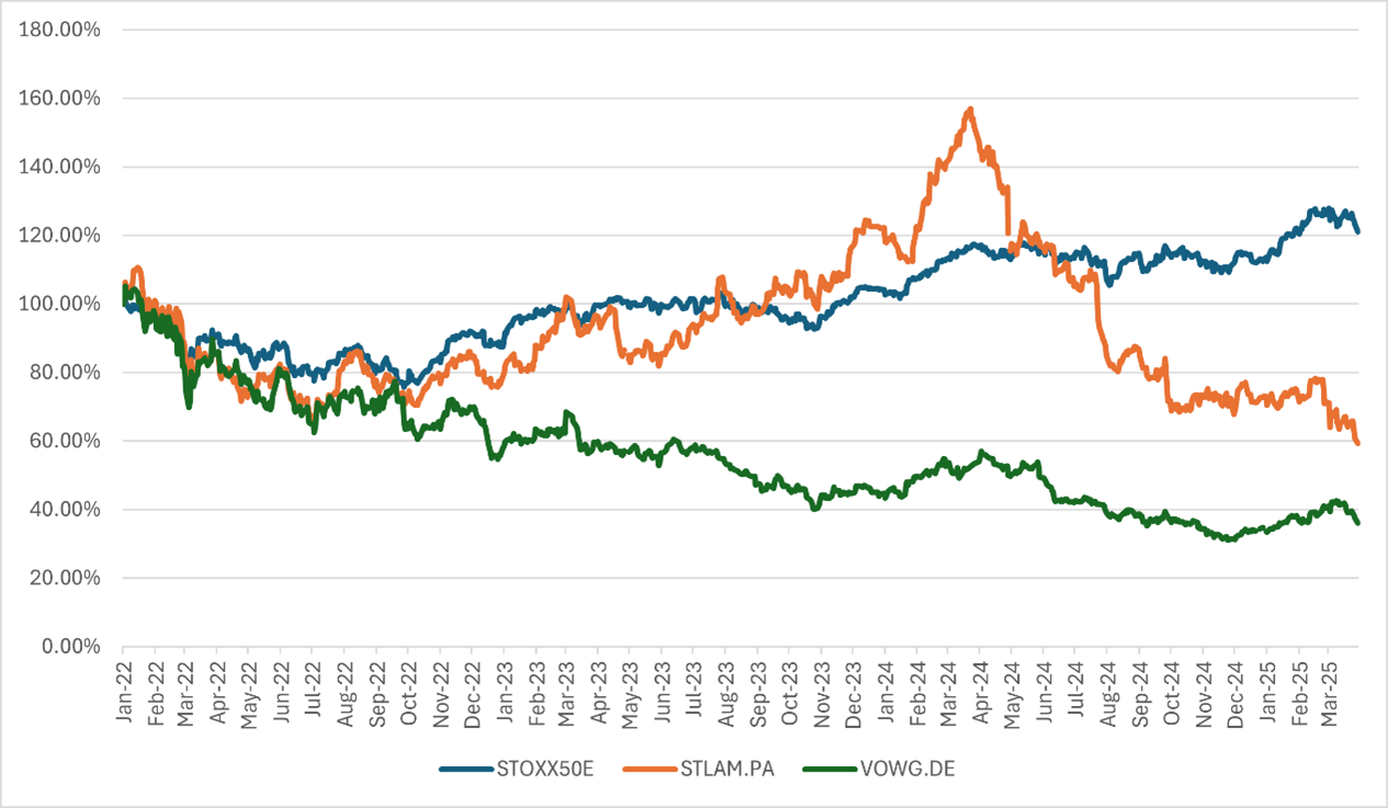 Stellantis has been on a much more volatile path than Volkswagen but there may be room for recovery, particularly if the business meets its long-term EV roadmap and cost-cutting objectives.