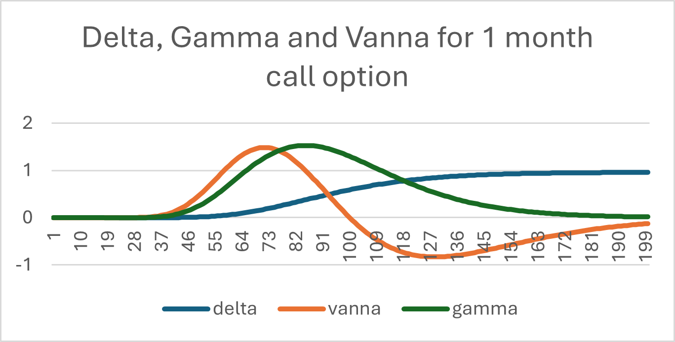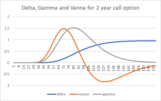 Vanna exhibits interesting behaviour, for which we can examine some examples. For a call option with two-year maturity, the chart below shows the values of Delta, Gamma and Vanna, rescaled as necessary: