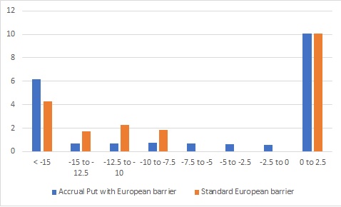 The graph shows the simulated probabilities of the IDAD downside accrual barrier and an otherwise identical product with a standard European barrier of 65%. (Source: FVC Structured Edge.) Firstly, this shows that the probability of not breaching the barrier is the same as would be expected. In both cases the final level of the index needs to be below 65% for the downside to knock in. The total probability of loss is also the same in both cases, 10.15%. The difference between the outcomes of the two barriers can be seen in the more granular breakdown where it becomes clear that the new accrual barrier has higher chances of larger losses.