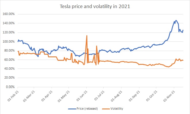 Fig 1: One year implied volatility and the rebased performance of Tesla Inc from 01 Feb 2021