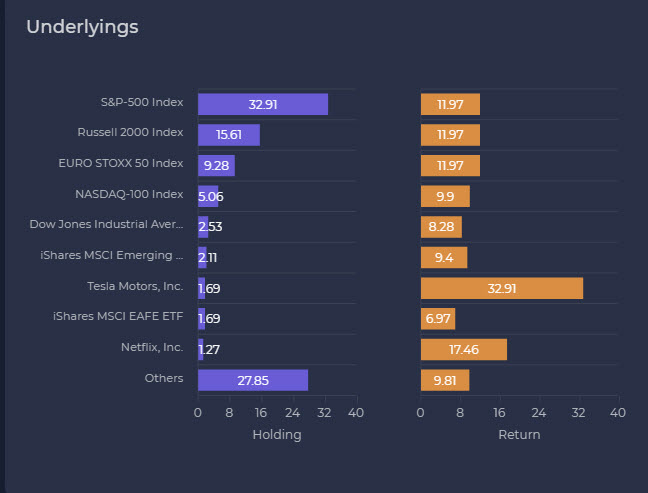 Output from the SRP/FVC structured product lifecycle application in Figure 2 gives a snapshot of structured product returns for a representative sample of US products. Whilst Tesla is a relatively small proportion of the holdings the annualised returns of Tesla based on product maturities and live valuations hugely outperform the other major underlyings. The products linked to Tesla are mostly Autocalls, Phoenix Autocalls or Reverse Convertibles which don’t require underlying growth to generate returns. Instead they pay coupons or auto-call payments which will be relatively high given the stock’s volatility level. The recent growth in the underlying will increase the chance of a positive return.